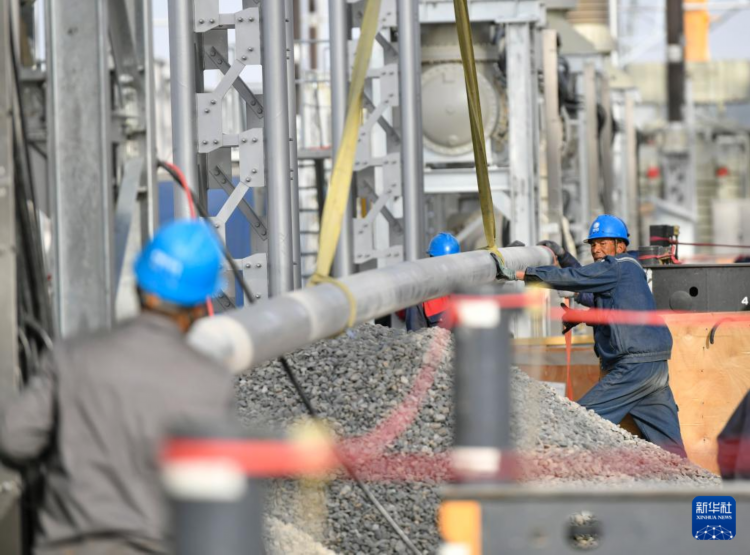 工人在新疆民豐750千伏變電站施工現場作業(11月10日攝)。