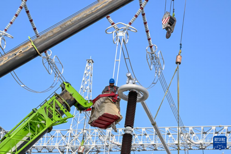 工人在新疆民豐750千伏變電站施工現場作業(11月10日攝)。