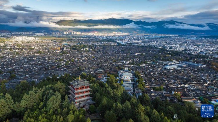 這是11月11日拍攝的麗江古城日出風光(無人機照片)。