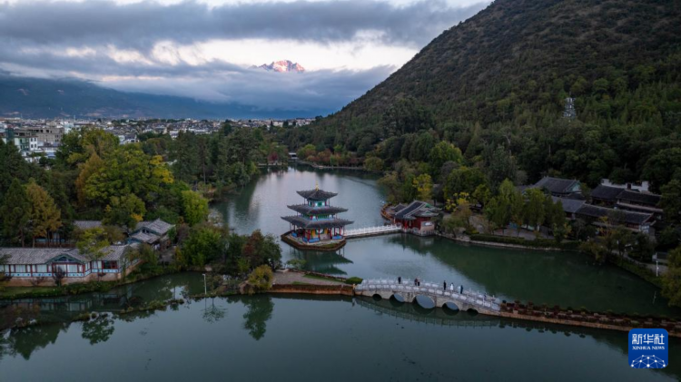 11月11日,游客在麗江市黑龍潭公園觀看玉龍雪山“日照金山”美景(無人機照片)。