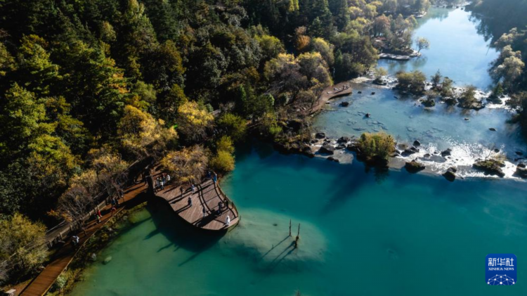 11月9日,游客在麗江市玉龍雪山景區藍月谷游玩(無人機照片)。