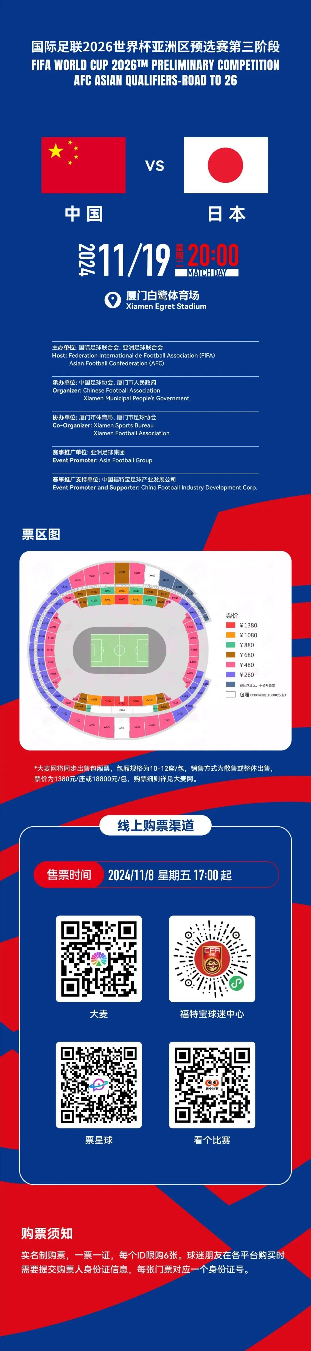 2024年11月19日中國(guó)國(guó)家男子足球隊(duì)在廈門主場(chǎng)迎戰(zhàn)日本隊(duì)的比賽門票將于11月8日17點(diǎn)起開始發(fā)售。此次售票渠道包括大麥網(wǎng)、“福特寶球迷中心”微信小程序、票星球、看個(gè)比賽。