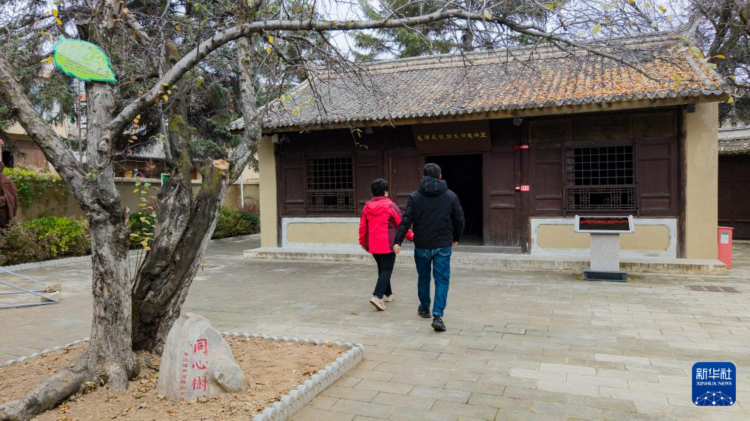 11月18日,游客走進全國重點文物保護單位哈達鋪會議舊址中的毛澤東、張聞天住室(義和昌藥鋪)參觀(無人機照片)。