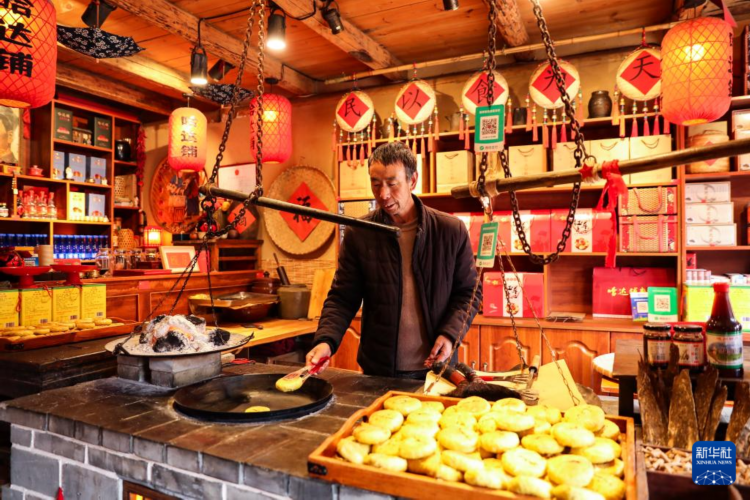 11月18日,在甘肅省隴南市宕昌縣哈達鋪鎮(zhèn)上街村,村民在哈達鋪紅軍街上的傳統(tǒng)民居鋪面內(nèi)烘烤點心。