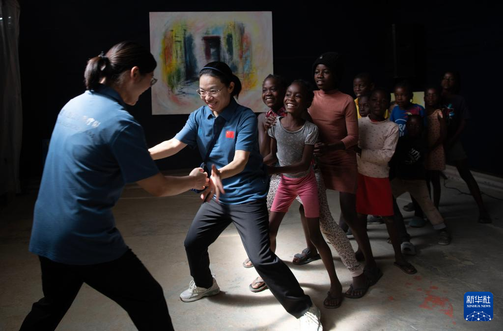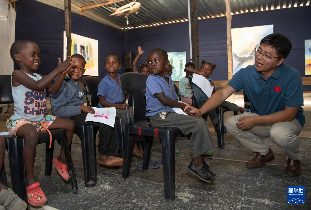11月20日,在納米比亞首都溫得和克附近的弗蘭斯藝術培訓中心,中國醫生與孩子們做游戲。 11月20日是世界兒童日,第十六批中國援納醫療隊的四名隊員一早就來到了距離首都溫得和克20多公里的弗蘭斯藝術培訓中心,為在此就讀的45名生活在貧民區的孩子進行身體和口腔健康檢查,并給孩子們準備了學習用品、繪畫工具和食品。 新華社記者 陳誠 攝