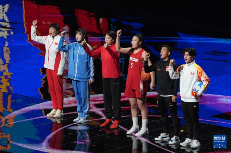 11月20日,前中國女排運動員楊昊(左一)、前中國女籃運動員宋曉波(左三)、前中國男足運動員黃博文(右二)和三名參賽運動員在開幕式上。