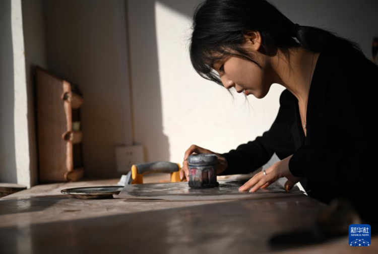 12月3日,在洛陽花城美陶工作室,成果將扎好的畫稿拓印至素坯上。