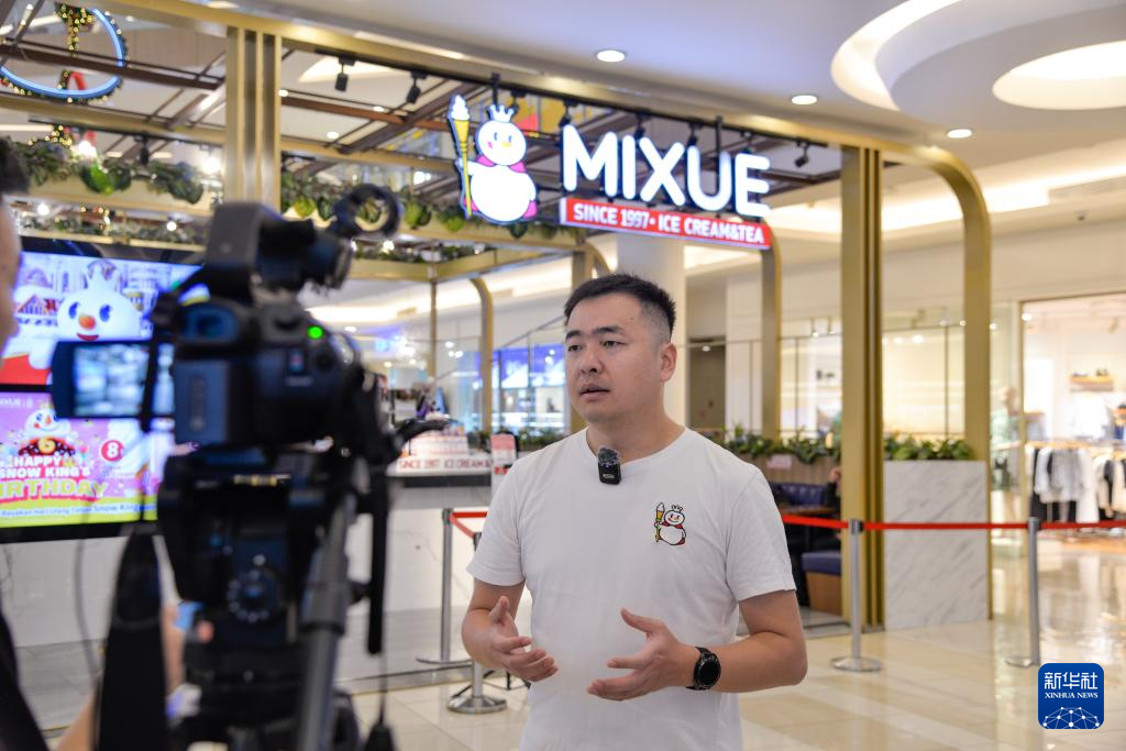 11月29日,在印度尼西亞雅加達一家蜜雪冰城門店,蜜雪冰城印尼公司營運負責人韓文超接受新華社記者采訪。 新華社記者 徐欽 攝