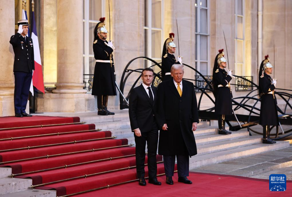馬克龍與特朗普會晤 12月7日,法國總統(tǒng)馬克龍(前左)在巴黎總統(tǒng)府愛麗舍宮歡迎美國當(dāng)選總統(tǒng)特朗普(前右)。 法國總統(tǒng)馬克龍7日在愛麗舍宮與受邀出席巴黎圣母院重新開放儀式的美國當(dāng)選總統(tǒng)特朗普會晤。 新華社記者 高靜 攝