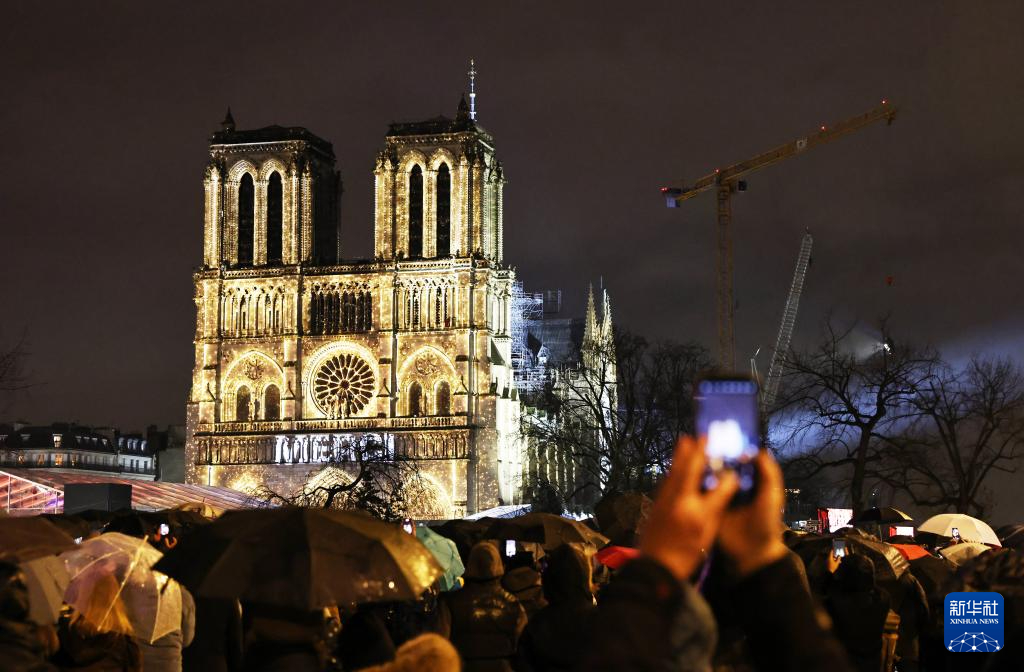 法國舉行儀式慶祝巴黎圣母院重新開放 12月7日,人們冒雨聚集在法國巴黎圣母院外,燈光在外墻上打出法語“謝謝”字樣。 法國7日晚在位于塞納河畔的巴黎圣母院舉行儀式,慶祝2019年失火的巴黎圣母院經(jīng)過5年修復(fù)后重新開放。 新華社記者 高靜 攝