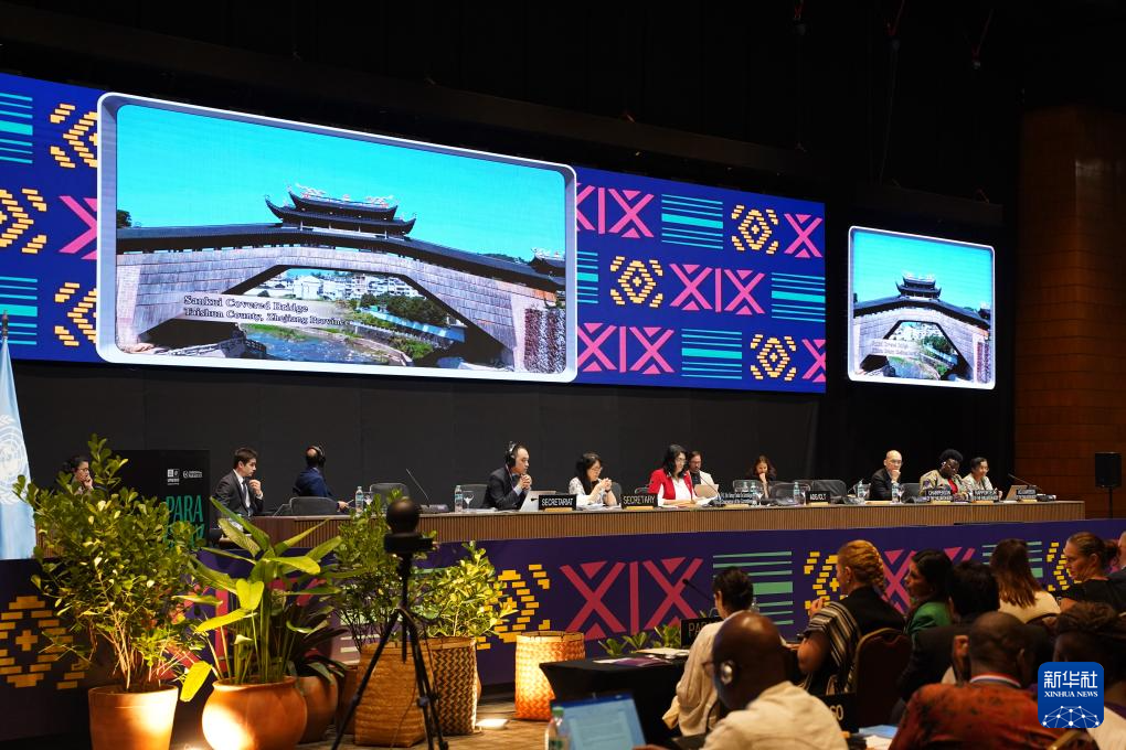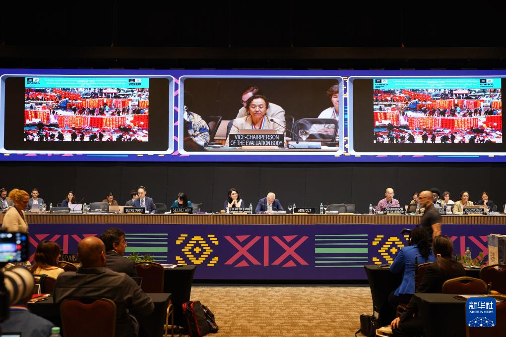 中國3個遺產(chǎn)項目轉(zhuǎn)入人類非物質(zhì)文化遺產(chǎn)代表作名錄 12月5日,在巴拉圭亞松森聯(lián)合國教科文組織保護(hù)非物質(zhì)文化遺產(chǎn)政府間委員會第19屆常會評審現(xiàn)場,大屏幕播放“中國木拱橋傳統(tǒng)營造技藝”宣傳視頻。 正在巴拉圭亞松森舉行的聯(lián)合國教科文組織保護(hù)非物質(zhì)文化遺產(chǎn)政府間委員會第19屆常會5日通過評審,決定將“黎族傳統(tǒng)紡染織繡技藝”“羌年”“中國木拱橋傳統(tǒng)營造技藝”3個遺產(chǎn)項目從急需保護(hù)的非物質(zhì)文化遺產(chǎn)名錄轉(zhuǎn)入人類非物質(zhì)文化遺產(chǎn)代表作名錄。 新華社記者 朱雨博 攝