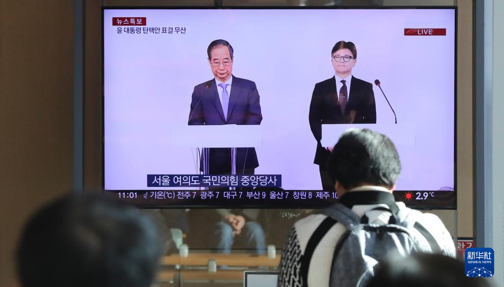 韓國執(zhí)政黨黨首與國務(wù)總理:總統(tǒng)將不再參與國政 12月8日,在韓國首爾火車站,民眾觀看韓國執(zhí)政黨黨首韓東勛與國務(wù)總理韓德洙(左)共同會見記者的電視直播。 當(dāng)日,韓國執(zhí)政黨國民力量黨黨首韓東勛與國務(wù)總理韓德洙共同會見記者時表示,將有秩序地推進(jìn)提早結(jié)束總統(tǒng)任期,總統(tǒng)尹錫悅下臺前將不再參與包括外交在內(nèi)的國政事務(wù)。 新華社記者 姚琪琳 攝