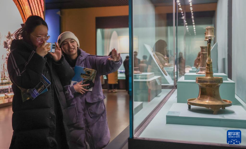 “古波斯的榮耀——伊朗文物精華展”在新疆開幕 12月6日,參觀者在“古波斯的榮耀——伊朗文物精華展”拍攝黃銅燭臺。 新華社記者 陳朔 攝