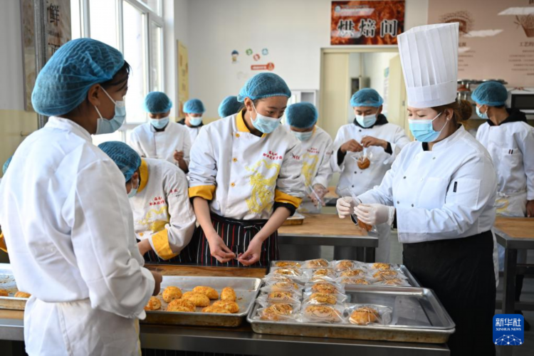 12月17日,青海省海南藏族自治州職業技術學校烹飪專業教師黃雪妍(前右)在指導學生學習西點烘焙。