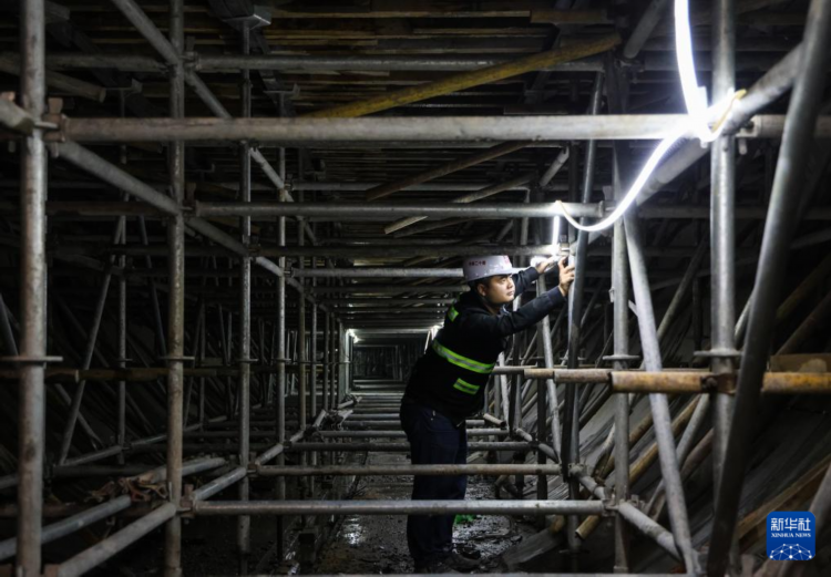 12月23日,中鐵二十局安全糾察員在深圳地鐵16號線共建管廊內檢查分倉中板澆筑支撐結構。