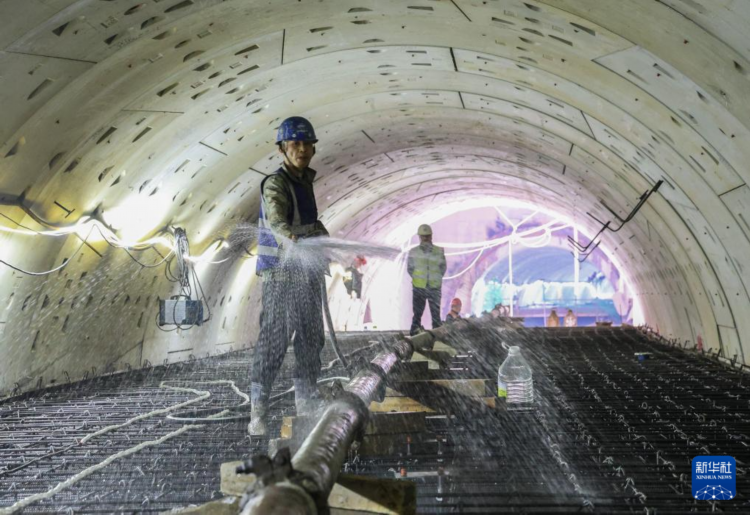 12月23日,中鐵二十局施工人員在深圳地鐵16號線共建管廊內向分倉中板鋼筋籠澆水加濕。