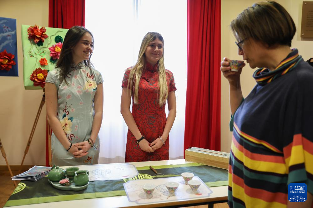 4月8日,在意大利羅馬國立住讀學校,學生們展示茶藝。