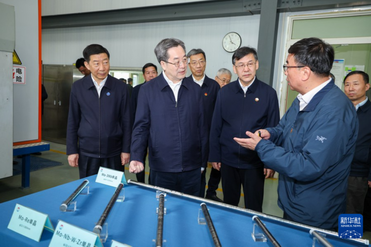 4月14日至16日,中共中央政治局常委、國務(wù)院副總理丁薛祥在陜西調(diào)研,并在西安主持召開座談會(huì)。這是4月15日,丁薛祥在西北有色金屬研究院,調(diào)研企業(yè)生產(chǎn)經(jīng)營、產(chǎn)業(yè)轉(zhuǎn)型升級(jí)等情況。新華社記者 劉彬 攝