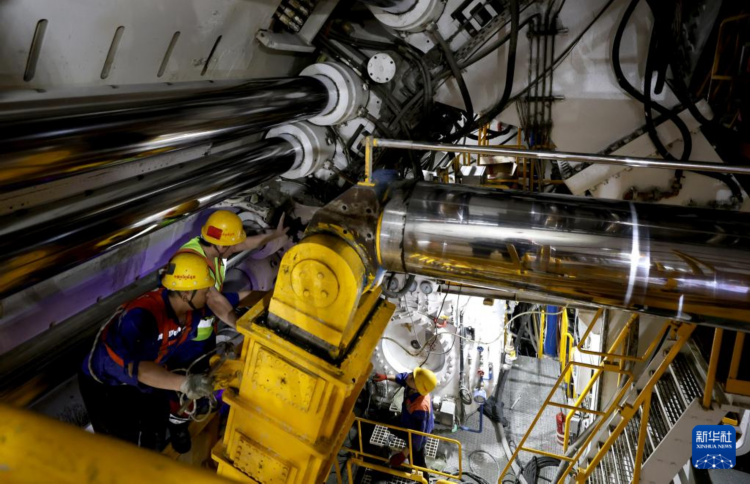 4月16日,技術工人在“領航號”盾構機刀盤后部進行施工作業。