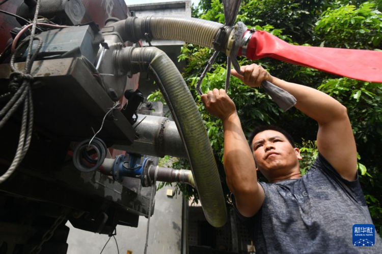 4月21日,在廣西馬山縣里當瑤族鄉(xiāng)北屏村,送水人員將水從運水車引入水柜。