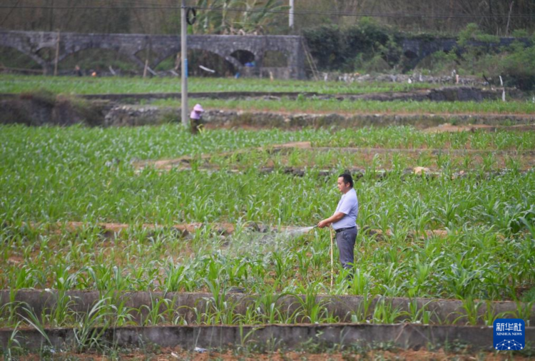 4月21日,廣西都安瑤族自治縣地蘇鎮(zhèn)鎮(zhèn)和村村民在給玉米澆水。
