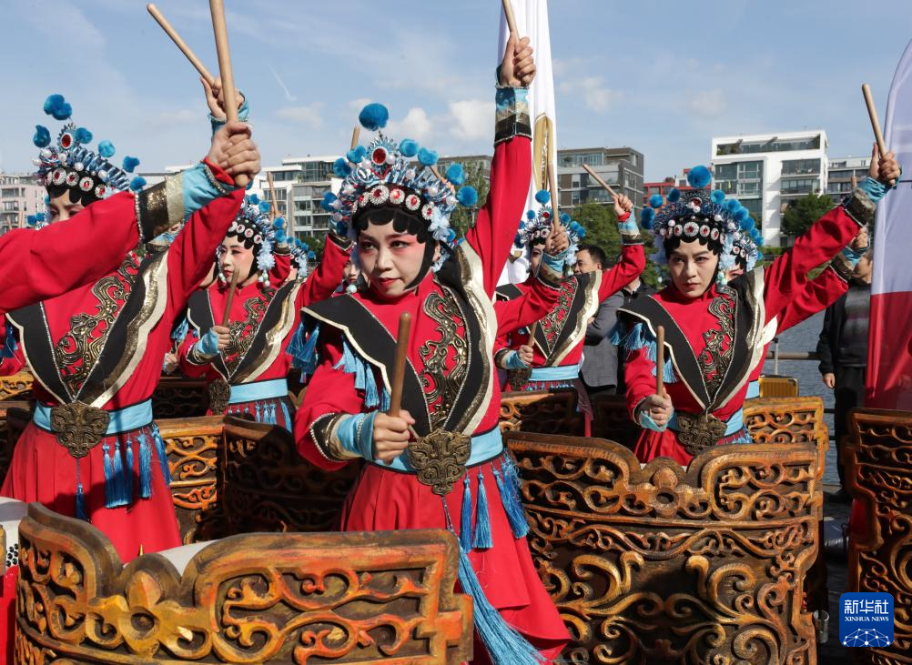 5月24日,中國陜西神木楊家將戰(zhàn)鼓在德國法蘭克福國際龍舟友誼賽期間表演。
