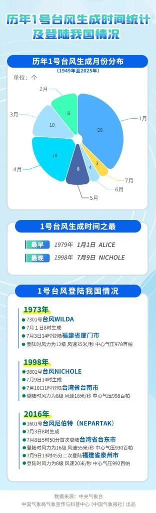 氣象上通常將當年西北太平洋及南海生成的首個編號臺風稱為“初臺”。統計顯示,每年1號臺風生成的時間分散在1月至7月。1979年的“初臺”在元旦當天就生成了,而1998年的“初臺”則直到7月9日才出現。常年平均“初臺”生成時間為3月25日,從這個角度看,今年第一個臺風有點姍姍來遲了。