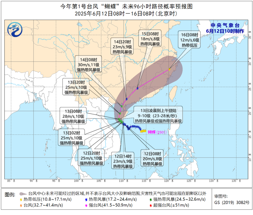 受“蝴蝶”和西南季風疊加影響,12日至14日華南大部將有大到暴雨,局地大暴雨或特大暴雨。南海大部、北部灣、瓊州海峽、西沙群島、南沙群島、中沙群島、廣東沿海、海南島沿海、廣西沿海將有6至8級風,陣風9至10級,臺風中心經過的附近海域陣風可達12至13級。