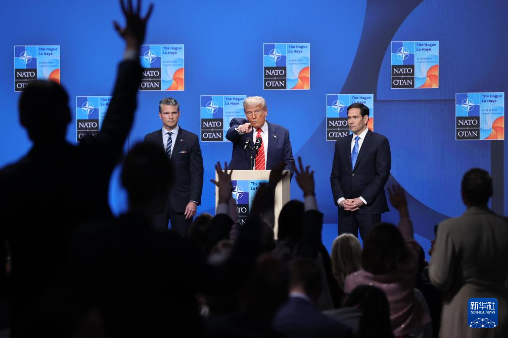 6月25日,在荷蘭海牙,美國總統特朗普(中)在北約峰會后出席記者會。新華社記者 趙丁喆 攝