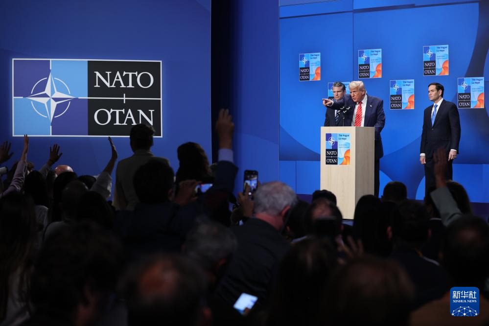6月25日,在荷蘭海牙,美國總統特朗普(前)在北約峰會后出席記者會。新華社記者 趙丁喆 攝