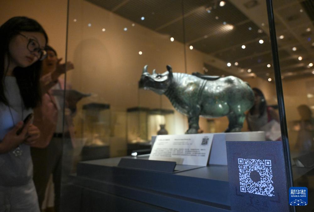 這是7月21日拍攝的錯(cuò)金銀云紋青銅犀尊與"美之道"二維碼。
