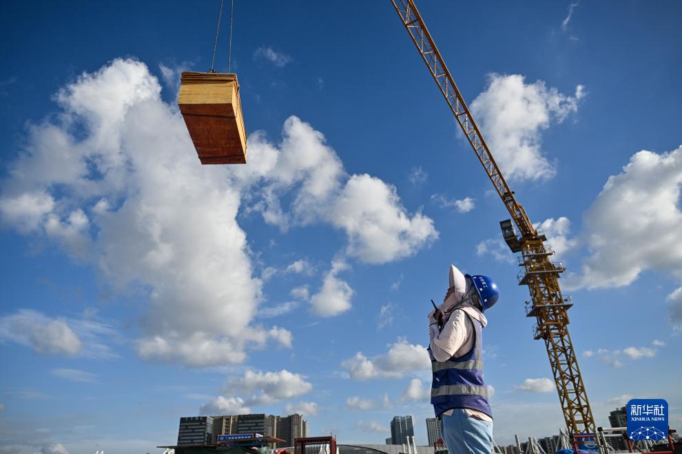 7月21日,中鐵建工工人在施工現(xiàn)場(chǎng)指揮塔吊作業(yè)。
