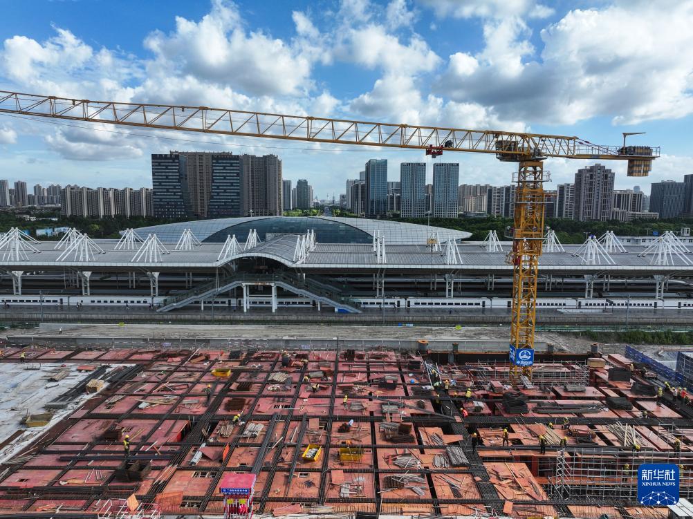 7月21日拍攝的新建上海至南京至合肥高速鐵路南通站站房施工現(xiàn)場(chǎng)(無(wú)人機(jī)照片)。
