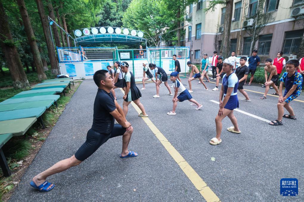 7月22日,國家中級游泳救生員、浙江省湖州市第五中學教育集團體育老師徐剛強(左一)在暑期愛心公益游泳班上帶領孩子們做熱身運動。