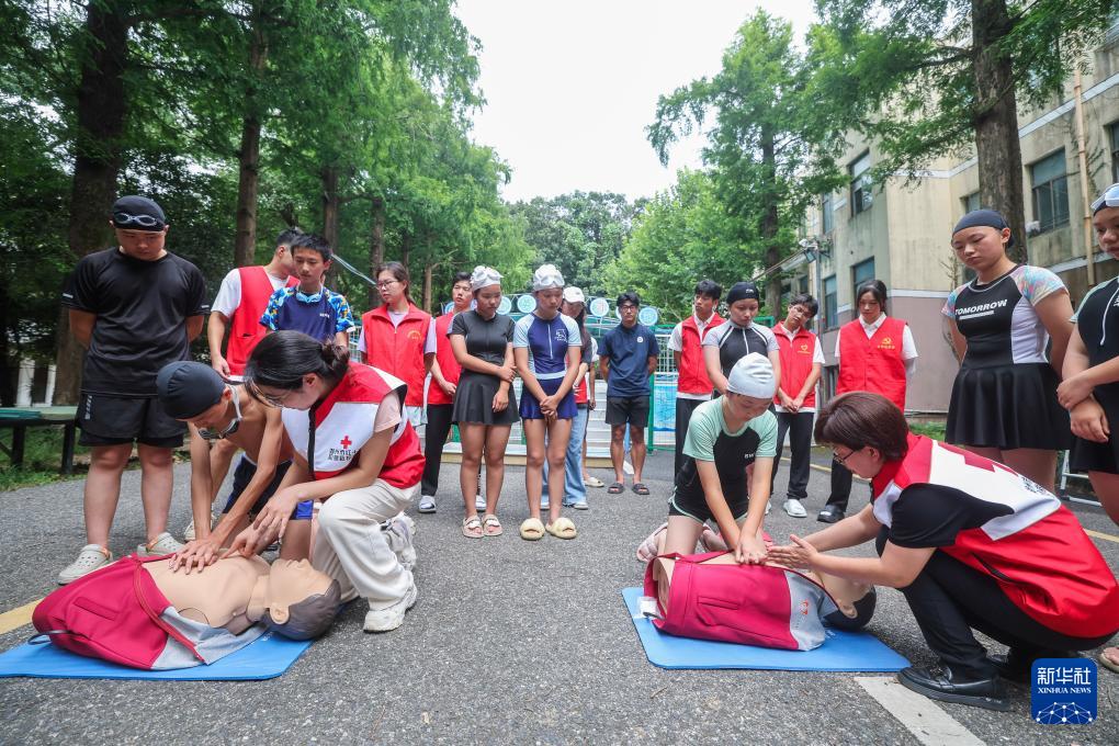 7月22日,湖州師范學院/湖州市紅十字應急救護學院的志愿者在暑期愛心公益游泳班上教學生們心肺復蘇急救知識。