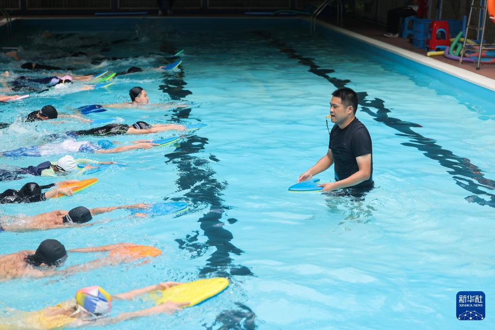 7月22日,國家中級游泳救生員、浙江省湖州市第五中學教育集團體育老師徐剛強(左一)在暑期愛心公益游泳班上教孩子們學習游泳。