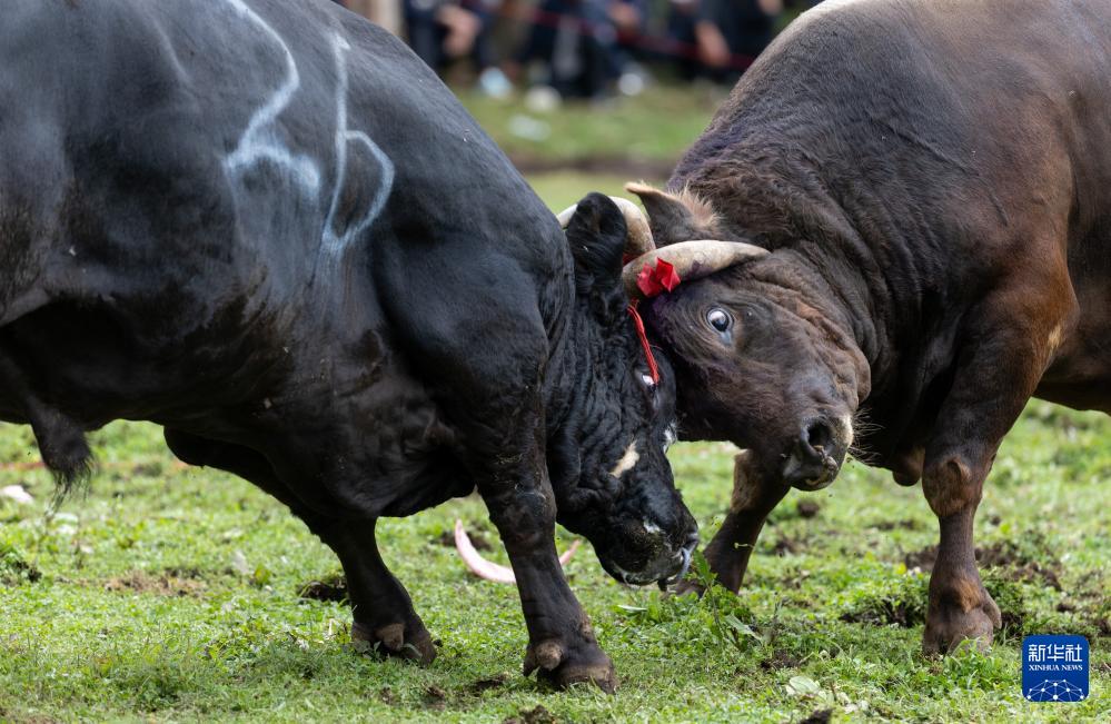 在布拖縣龍?zhí)舵?zhèn)包谷坪火把場舉行的斗牛比賽(7月21日攝)。
