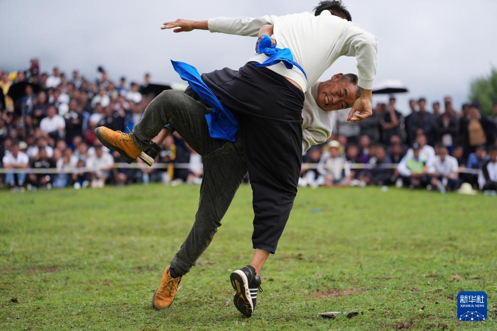 在布拖縣龍?zhí)舵?zhèn)包谷坪火把場舉行的彝族傳統(tǒng)摔跤比賽(7月21日攝)。