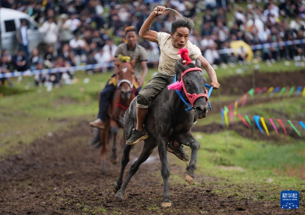 當地彝族群眾在布拖縣龍?zhí)舵?zhèn)包谷坪火把場參加賽馬(7月21日攝)。