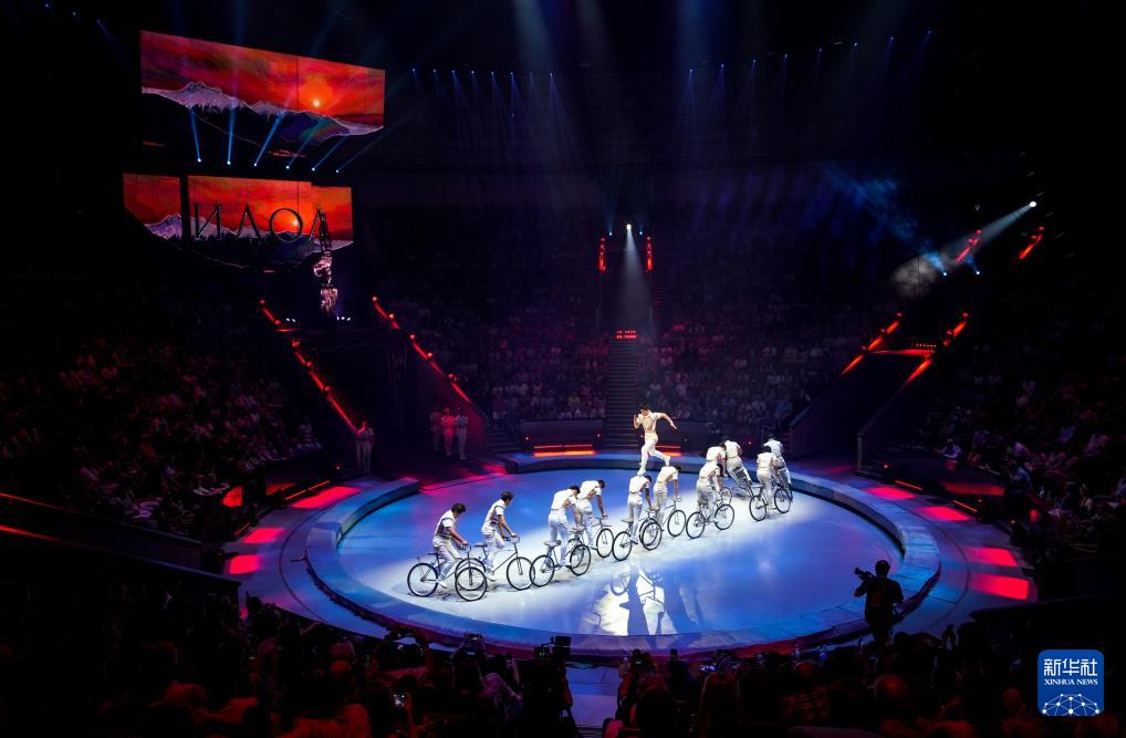 7月20日,在俄羅斯莫斯科,中國雜技團演員表演《馭風凌霄——男子集體車技》。