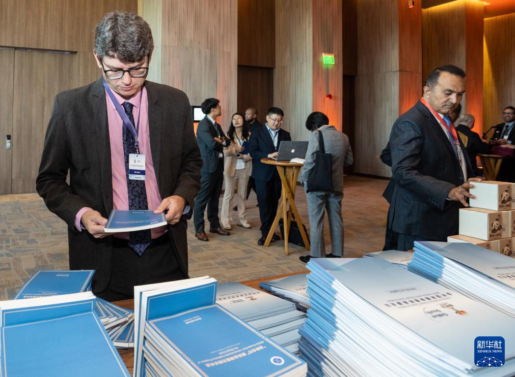 7月16日,在巴西里約熱內盧舉行的金磚國家媒體智庫高端論壇上,與會代表翻閱《"金磚合作"推動全球南方攜手共進》智庫報告。