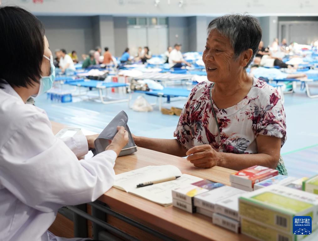 7月29日,村民在北京市平谷區體育中心安置點測量血壓。