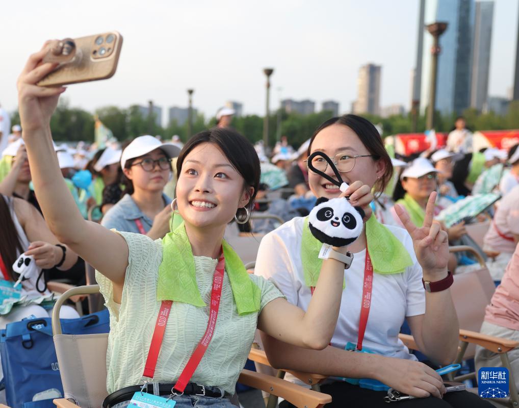 8月7日,觀眾在開幕式前自拍留影。