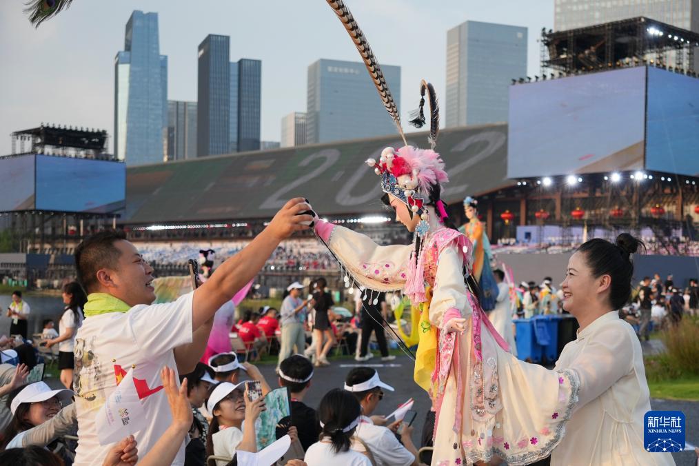 8月7日,觀眾在開幕式前與表演者互動。