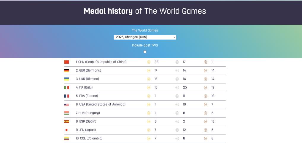 本屆世運會共設34個大項60個分項256個小項,中國體育代表團在18個項目(分項)上獲得金牌、45名運動員站上最高領獎臺,我國獲得世運會金牌的項目(分項)由此前累計的14個增加至23個。其中攀巖女子速度接力、蹼泳女子4×50米接力兩個項目創世界紀錄,自由式輪滑男子速度過樁等5個項目包攬冠亞軍,武術、攀巖、健美操、霹靂舞、自由式輪滑每個參賽小項都獲獎牌。