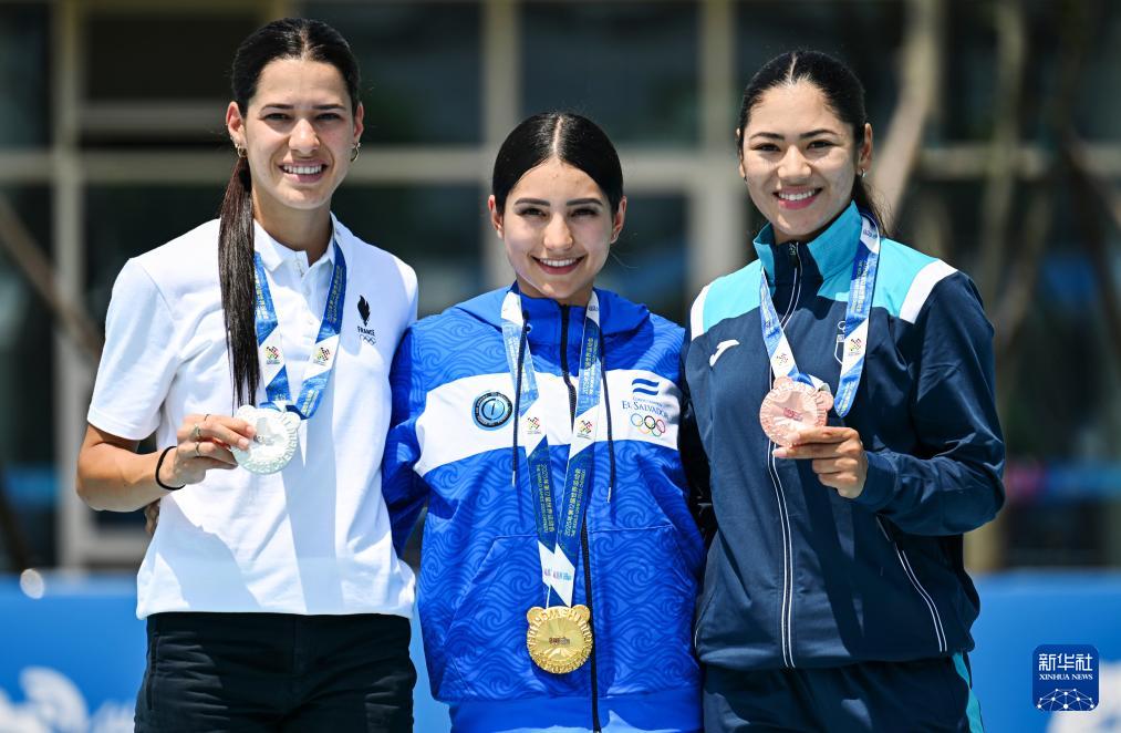 8月13日,冠軍薩爾瓦多隊(duì)選手加利亞多(中)、亞軍法國(guó)隊(duì)選手布呂內(nèi)(左)、季軍危地馬拉隊(duì)選手達(dá)利婭在頒獎(jiǎng)儀式上。