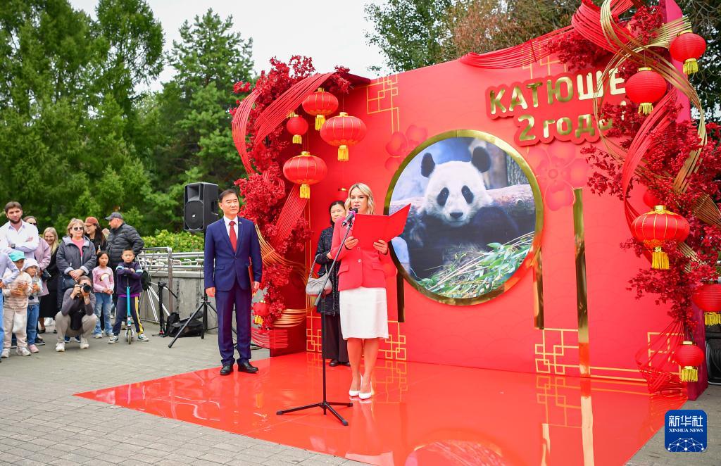 8月24日,俄羅斯莫斯科動物園園長阿庫洛娃在大熊貓“喀秋莎”2歲生日活動上致辭。新華社記者 張超群 攝