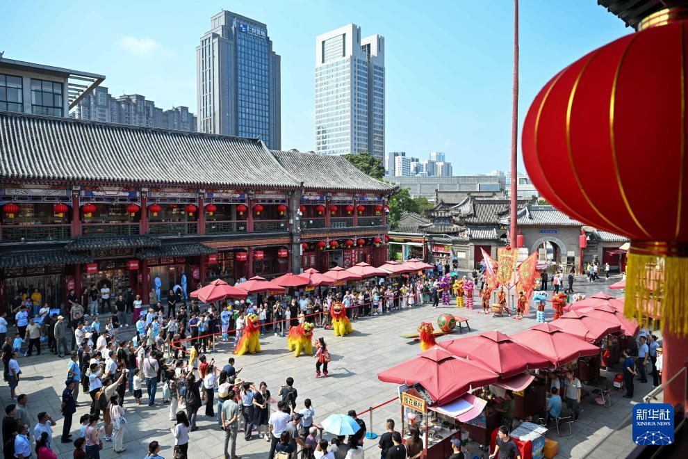 8月29日,媒體記者來到天津古文化街戲樓廣場和市民一起觀看舞獅表演。