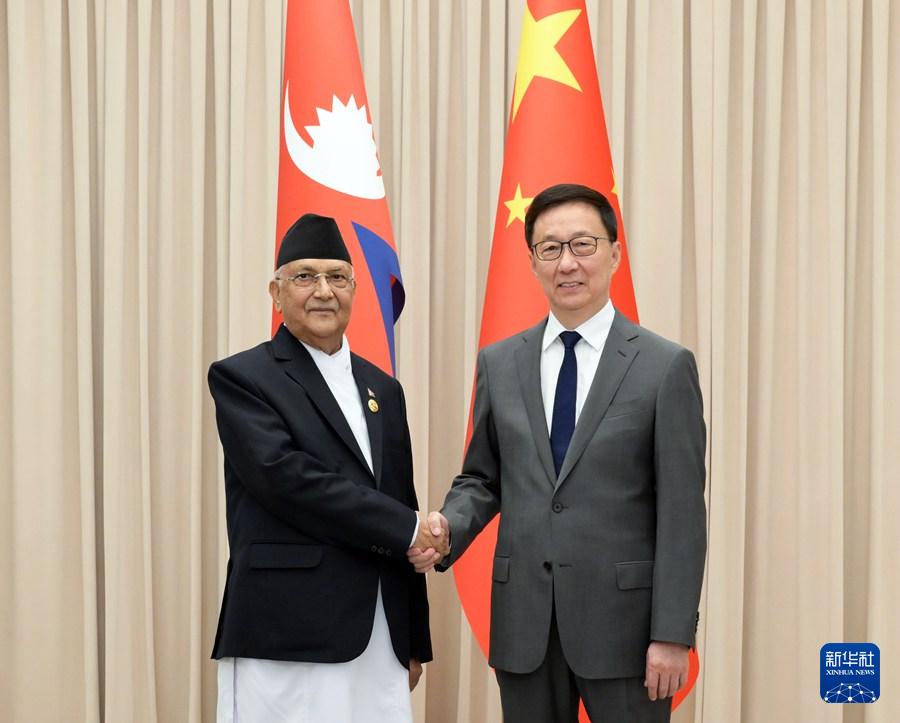 9月2日,國家副主席韓正在北京會見來華出席2025年上海合作組織峰會和紀念中國人民抗日戰爭暨世界反法西斯戰爭勝利80周年活動的尼泊爾總理奧利。新華社記者 高潔 攝