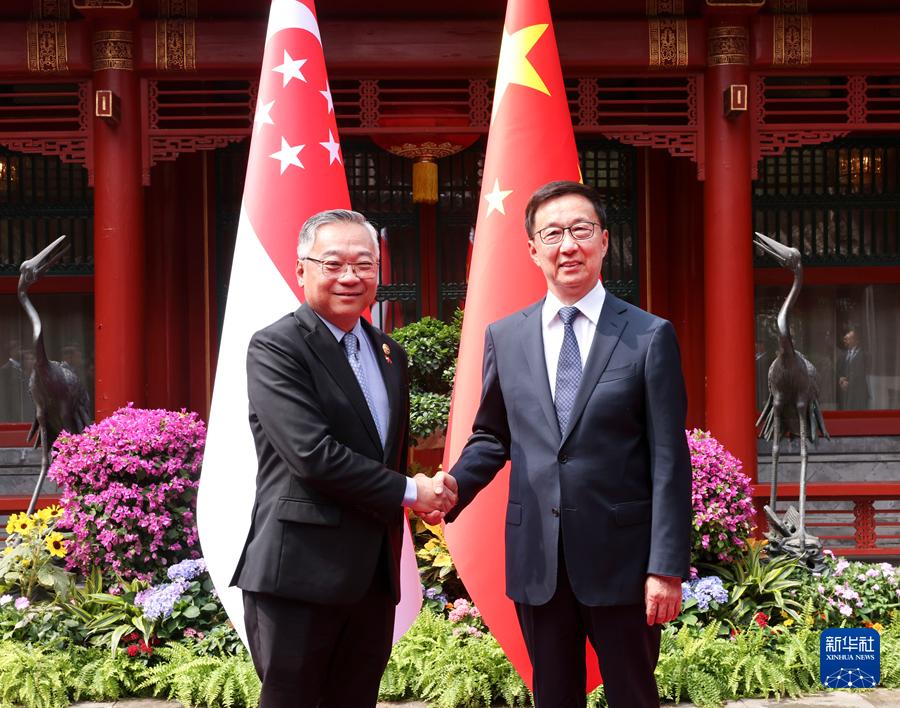 9月4日,國(guó)家副主席韓正在北京會(huì)見(jiàn)來(lái)華出席紀(jì)念中國(guó)人民抗日戰(zhàn)爭(zhēng)暨世界反法西斯戰(zhàn)爭(zhēng)勝利80周年活動(dòng)的新加坡副總理兼貿(mào)工部長(zhǎng)顏金勇。新華社記者 龐興雷 攝